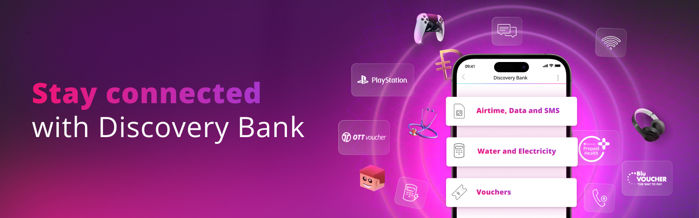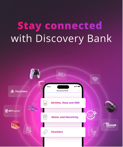 Your Discovery Bank app is the most convenient and affordable way to top up your airtime, data, prepaid water and electricity, and to buy digital vouchers for gaming, lifestyle, entertainment and more! It's easier than ever to stay connected or to treat yourself and your loved ones.