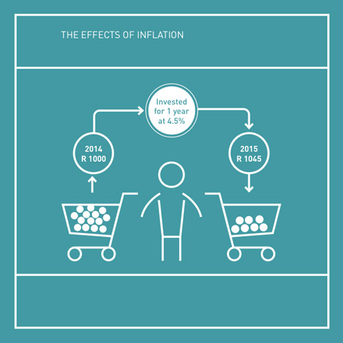 Of course, you could stash away money under a mattress or in a bank account, but because of inflation, your money will effectively be worth less every year. Let’s assume you have R1 000 to invest in a savings account and inflation (the increase in the general level of prices for goods and services) was 6%. To buy the same goods and services you could buy with R1 000 last year, your money must grow by 6%. In other words, you need R1 060 to buy the same goods and services. However, you only earn 4.5% interest (or R45) in the savings account, which gives you a total of R1045. This means you aren’t able to buy the same amount of goods and services because goods and services have increased by 6%.