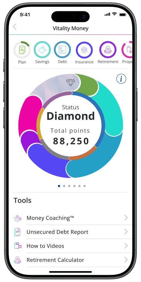 Vitality Money measures how well you manage your finances, from paying off your debts and saving for longer to making sure you have enough cover for unexpected events.