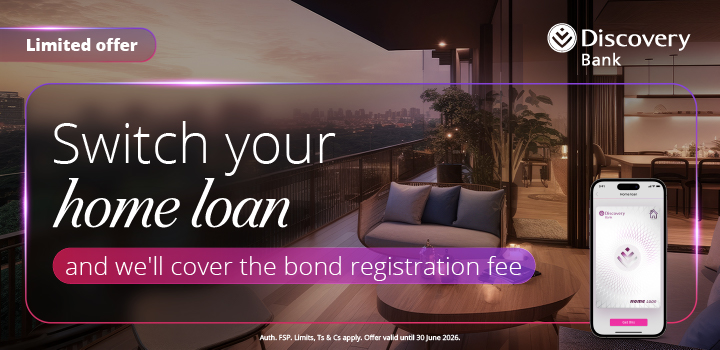 For a limited time, switching your home loan to Discovery Bank could save you thousands. We'll aim to match or beat your current home loan rate, and if we can't, you could get up to Ð5,000. Plus, we'll cover the bond registration fee!