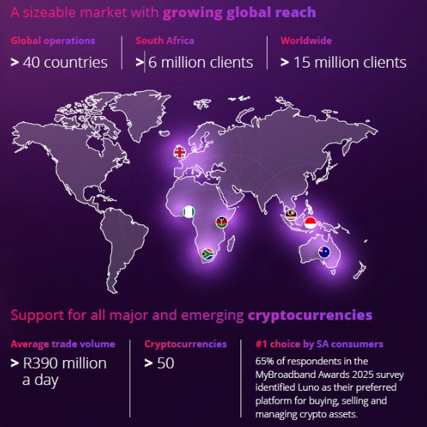 As a bank known for bringing you the future of banking now, we are thrilled to be the first mobile bank to partner with Luno , a leading crypto platform that is used by over 15 million clients. As we integrate platforms, you'll have the option to easily trade in cryptocurrencies through the Discovery Bank app. Your crypto balances and trades are available 24/7.