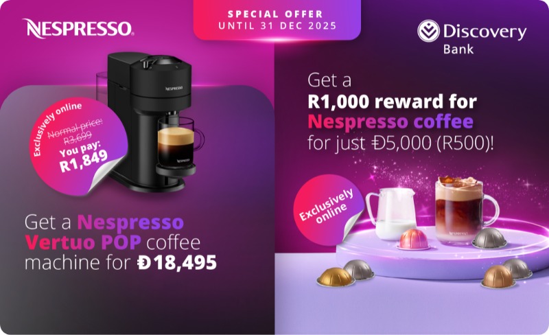 Điscovery Miles do not constitute currency or any other medium of exchange in circulation in South Africa. Rewards are based on your engagement in Vitality programmes, Discovery products, and monthly qualifying card spend. Discovery Bank, Auth FSP. Limits, terms and conditions apply.