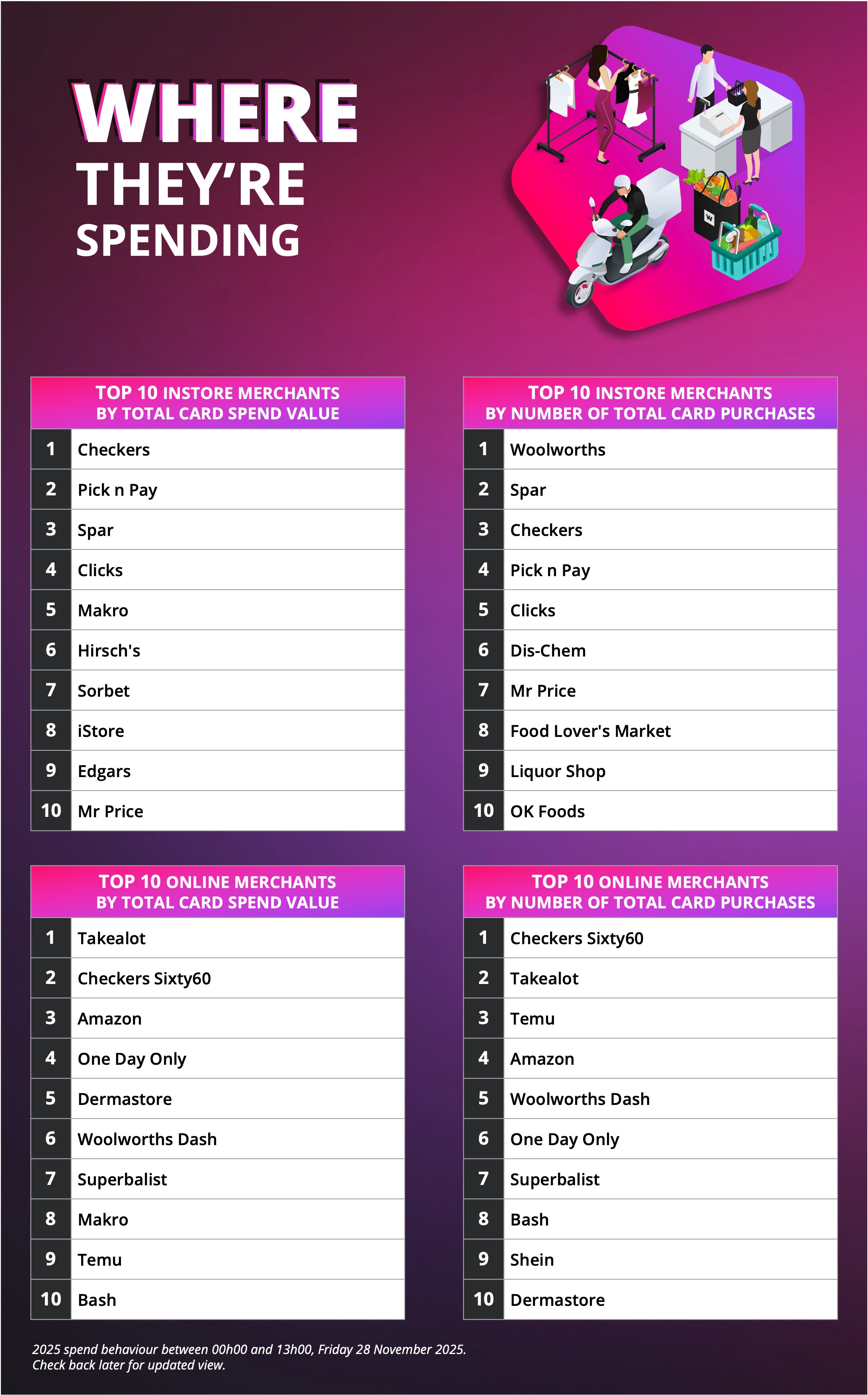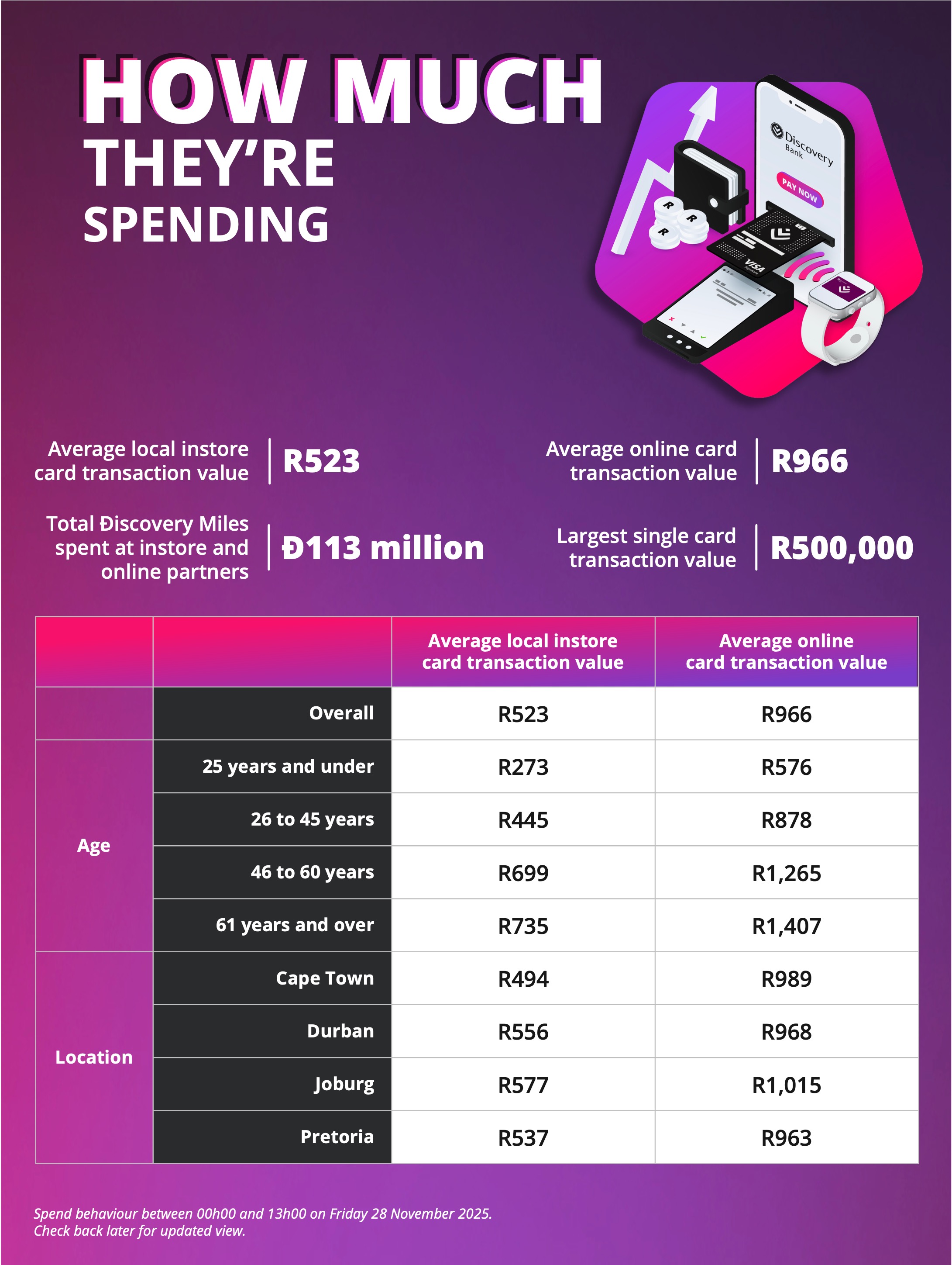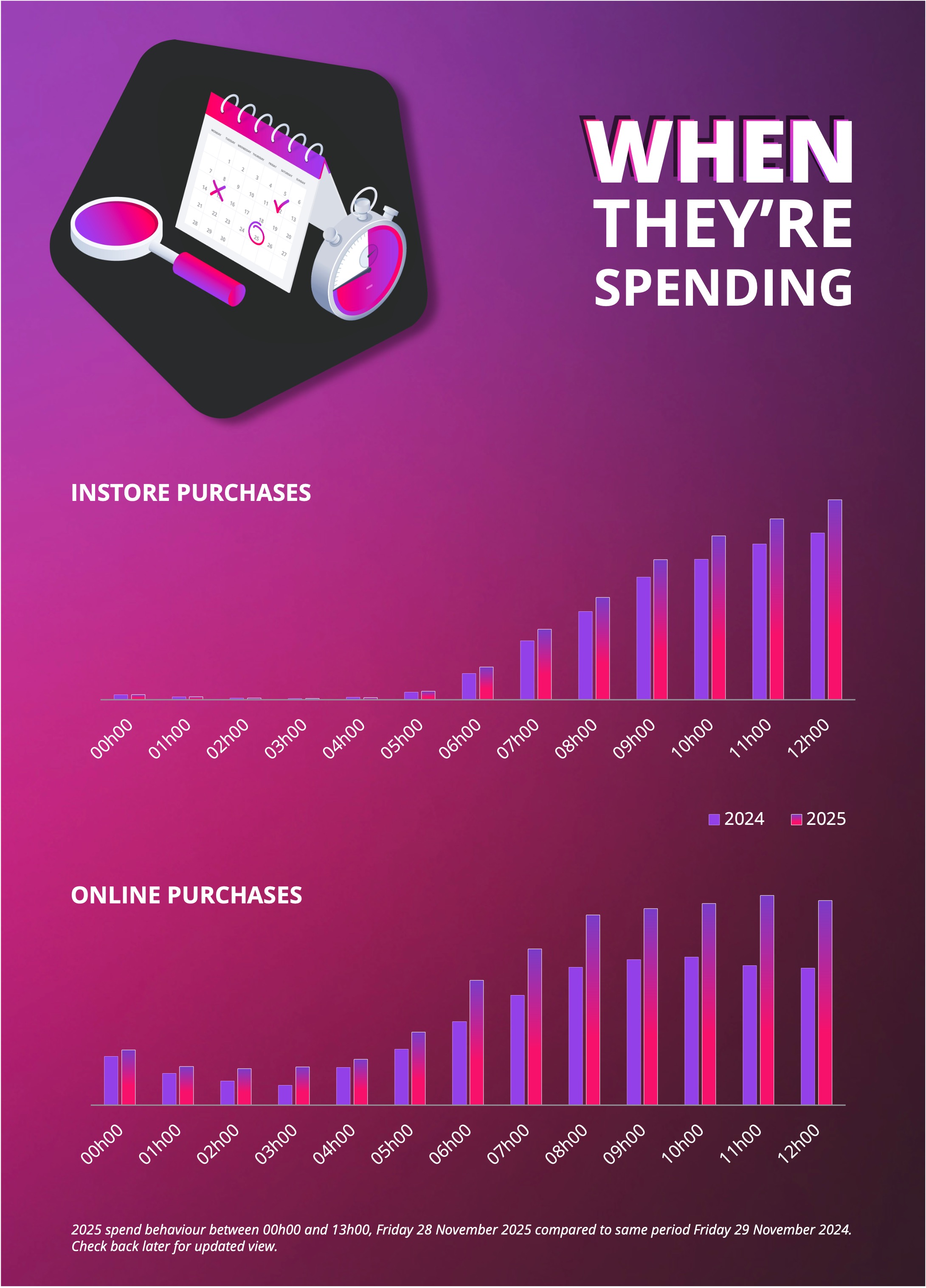 See how our clients are making the most of their spending and savings this Black Friday. Follow the SpendTrend25 tracker for fresh updates every three hours between 05h00 and 23h00 on Friday, 28 November 2025.