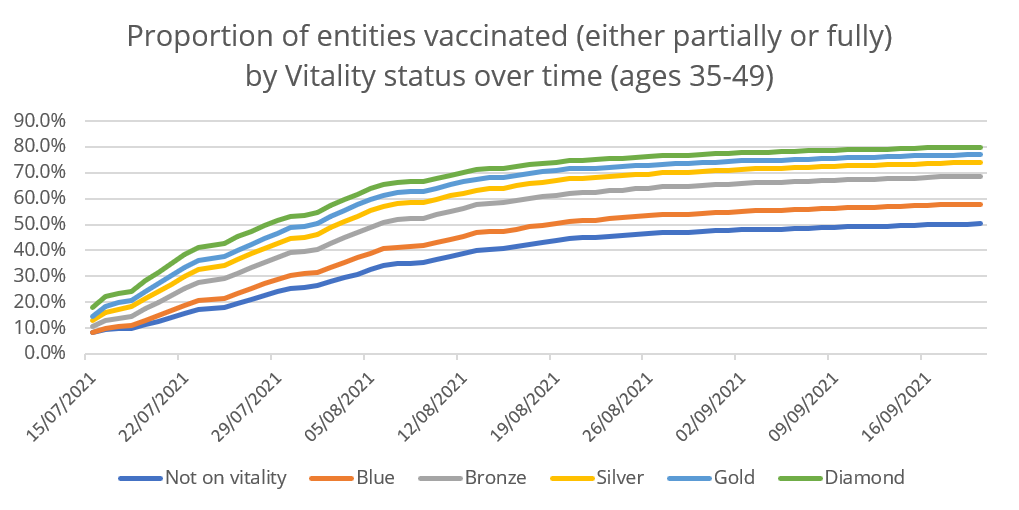 Perceptions of risk of severe COVID-19 related clinical outcomes drive vaccination rates. On the other hand, having had and recovered from COVID-19 seems a deterrent to vaccination, and we are exploring this further. We see that the more health-conscious our clients are, as measured by a higher Vitality status, the more likely they are to get vaccinated.