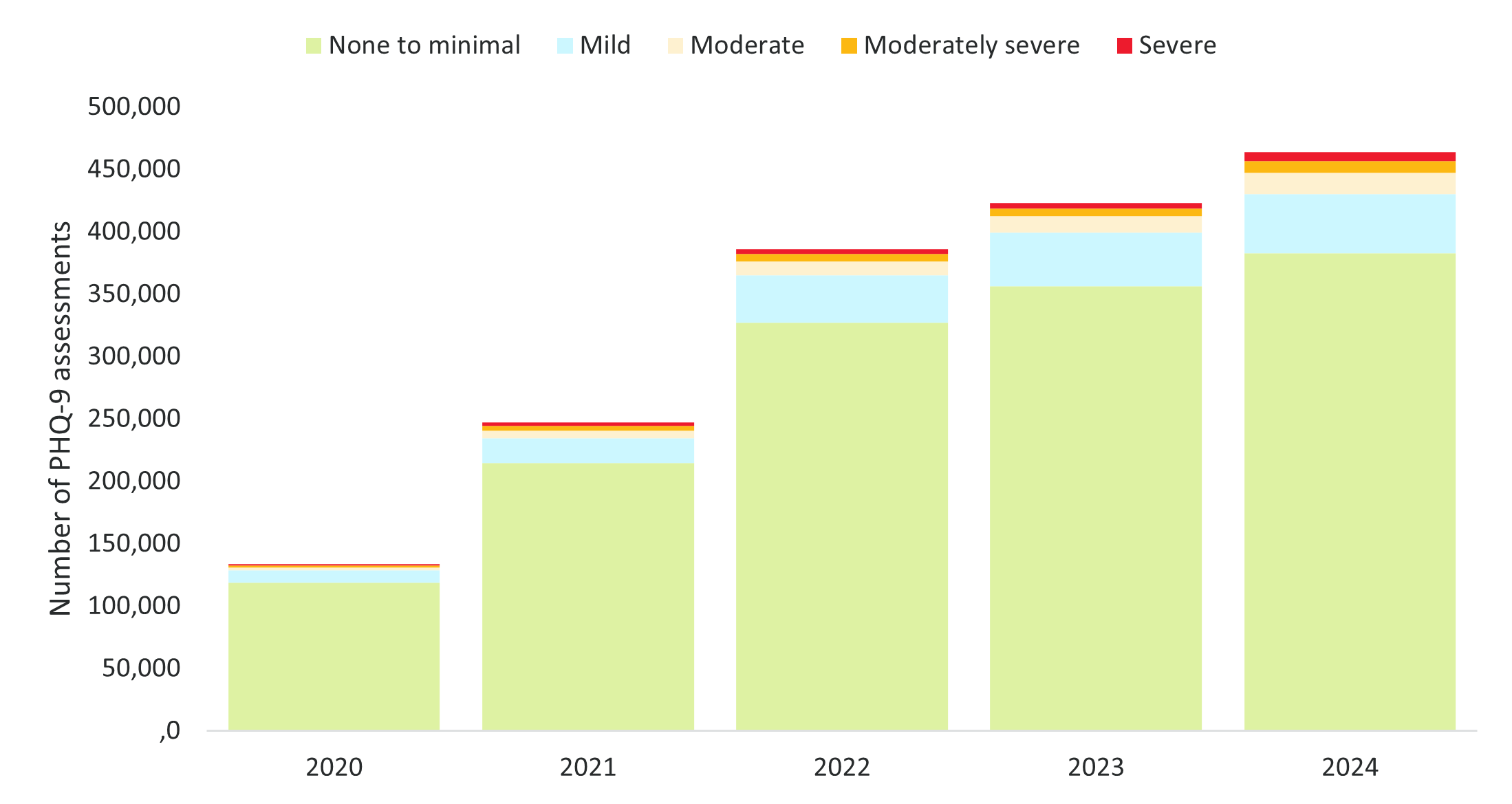 Since data collection began in 2020, the number of Scheme members who complete a PHQ‑9 assessment has grown each year. In 2024, 351,000 members completed 463,000 PHQ‑9 assessments, compared to the 118,000 members who completed 133,000 PHQ‑9 assessments in 2020 (Figure 1).