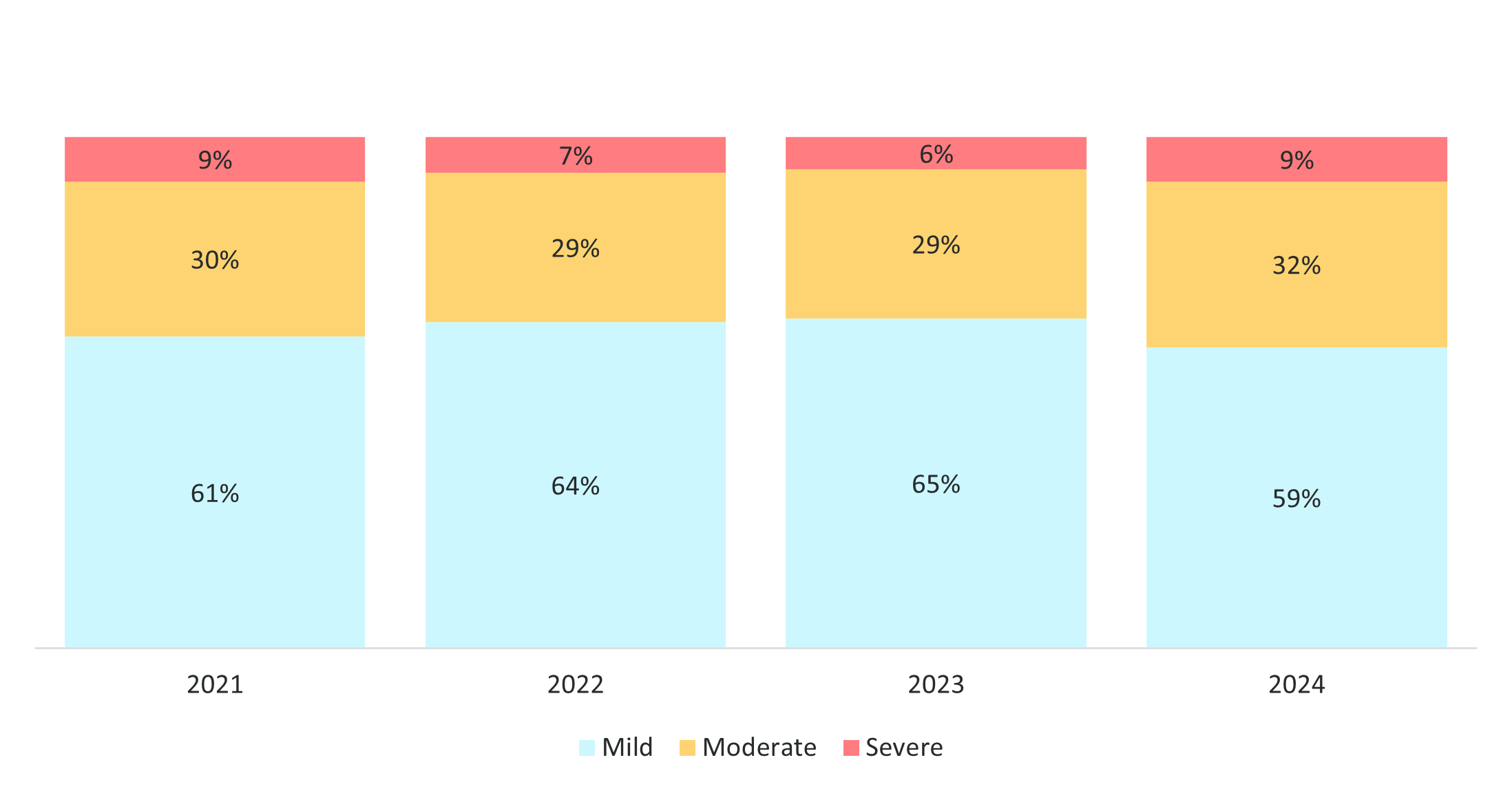 Figure 2 shows completed PHQ‑9 assessments with depression symptoms ranging from mild to severe between 2020 and 2024. The proportion of PHQ‑9 assessments showing moderate to severe symptoms (a PHQ‑9 score between 10 and 27) increased from 39% in 2020 to 41% in 2024. Conversely, the proportion of assessments showing mild symptoms (a PHQ‑9 score between 5 and 9) reduced from 61% in 2020 to 59% in 2024. This trend shows an increasing proportion of DHMS members with more severe depression symptoms.