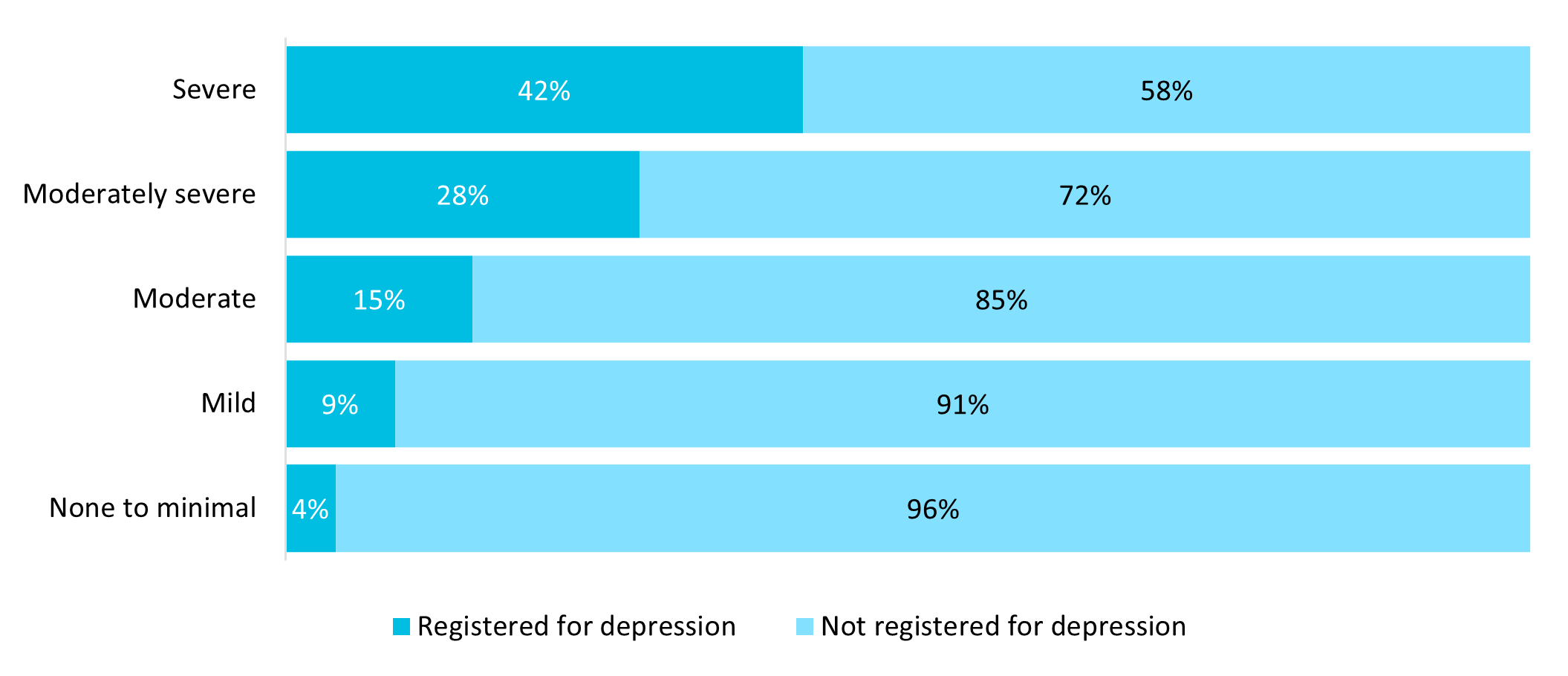 Of those members who completed a PHQ‑9 assessment, 6% were registered or claiming for depression at the time of their assessment. Of the members whose PHQ‑9 showed severe symptoms of depression, 42% were already registered for depression at the time of the assessment (Figure 3).