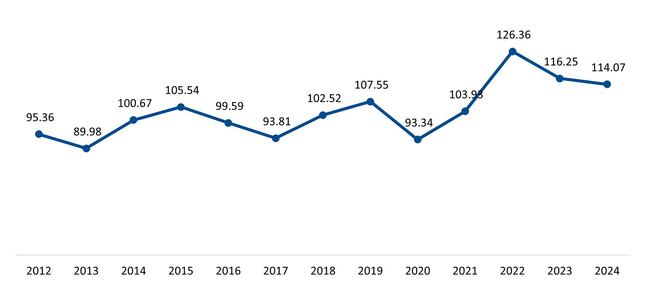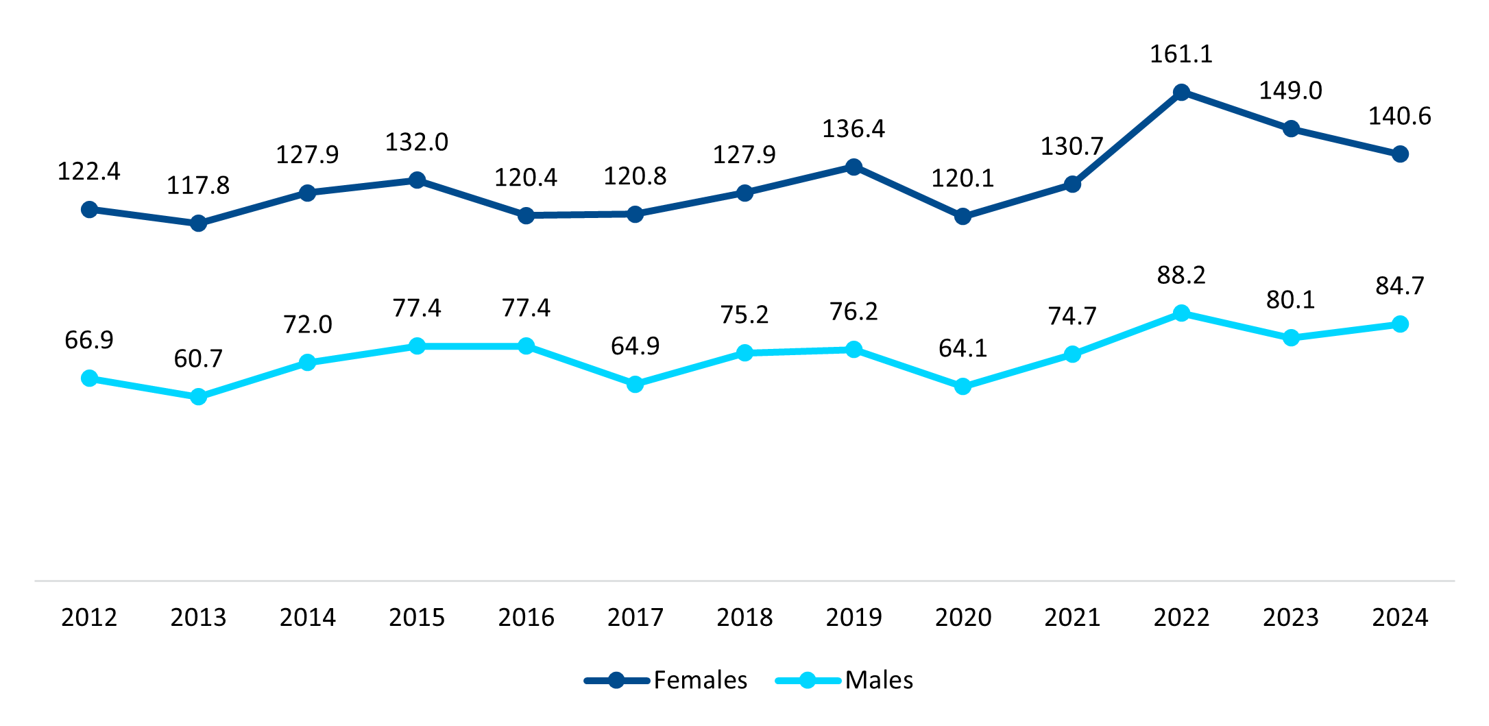 The data suggests that suicide or self‑harm claiming rates were 66% higher among female members than male members (140.6 for females vs 84.7 for males in 2024, as shown in Figure 5). This trend has been consistent over time and also aligns with international surveys which show that females have higher rates of suicidal behaviour or attempts.