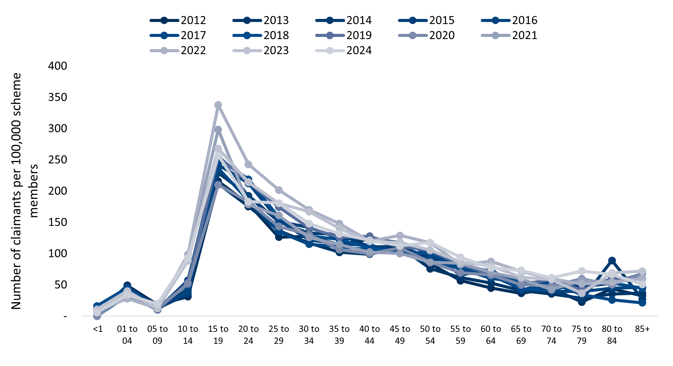 Figure 6: Number of DHMS members claiming for an ICD‑10 code associated with intentional suicide or self‑harm per 100,000 distinct lives by age