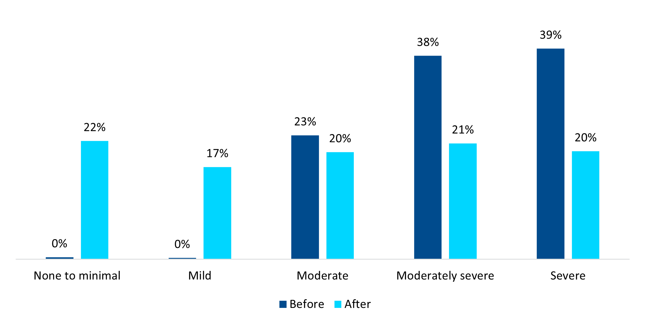The members' PHQ‑9 scores have been analysed. Their scores were recorded either on the day they joined the programme or in the six months beforehand. These scores were then compared to their scores after they completed the programme. It was found that 62% improved their PHQ‑9 score, 26% remained in the same band and 13% moved to a band with more severe symptoms. Of those who completed two PHQ‑9 tests, before and after they joined, the proportion of members in the 'None to minimal' and 'Mild' bands increased, whereas the proportion of members with moderate to severe depression decreased (Figure 7). This shows that the severity of depression symptoms reduced after members completed the Mental Health Care Programme.