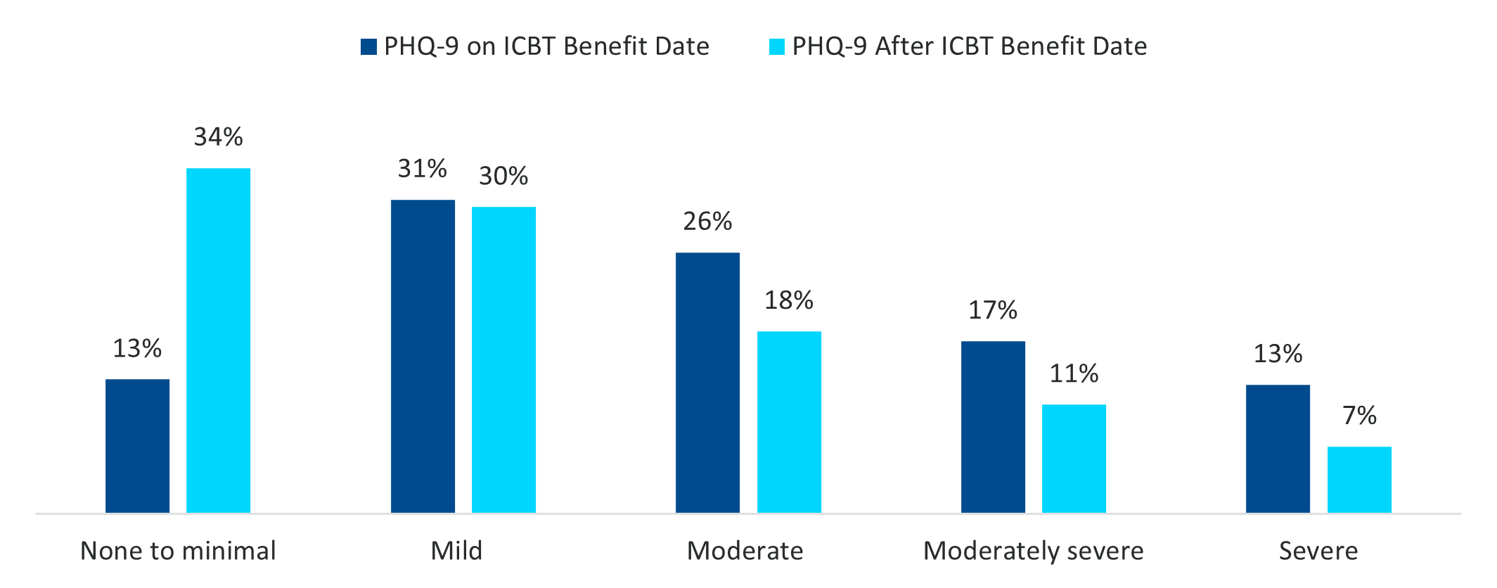 In DHMS members who took up this benefit and completed a PHQ‑9 assessment before and after the course, we have seen an improvement in PHQ‑9 scores after finishing the ICBT. Before the programme started, 56% of members had moderately severe to severe self‑reported depression symptoms. This is compared to only 35% of members after finishing the course (Figure 9). This digital solution offers cost‑effective, clinically validated and accessible mental healthcare.