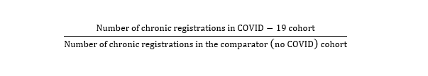 A result, or ratio >1 means that in the months after people get and recover from COVID-19, there's a higher chronic registration rate in the COVID-19 study population relative to the non-COVID19 population. Where the relative risk ratio is <1, the opposite is true.