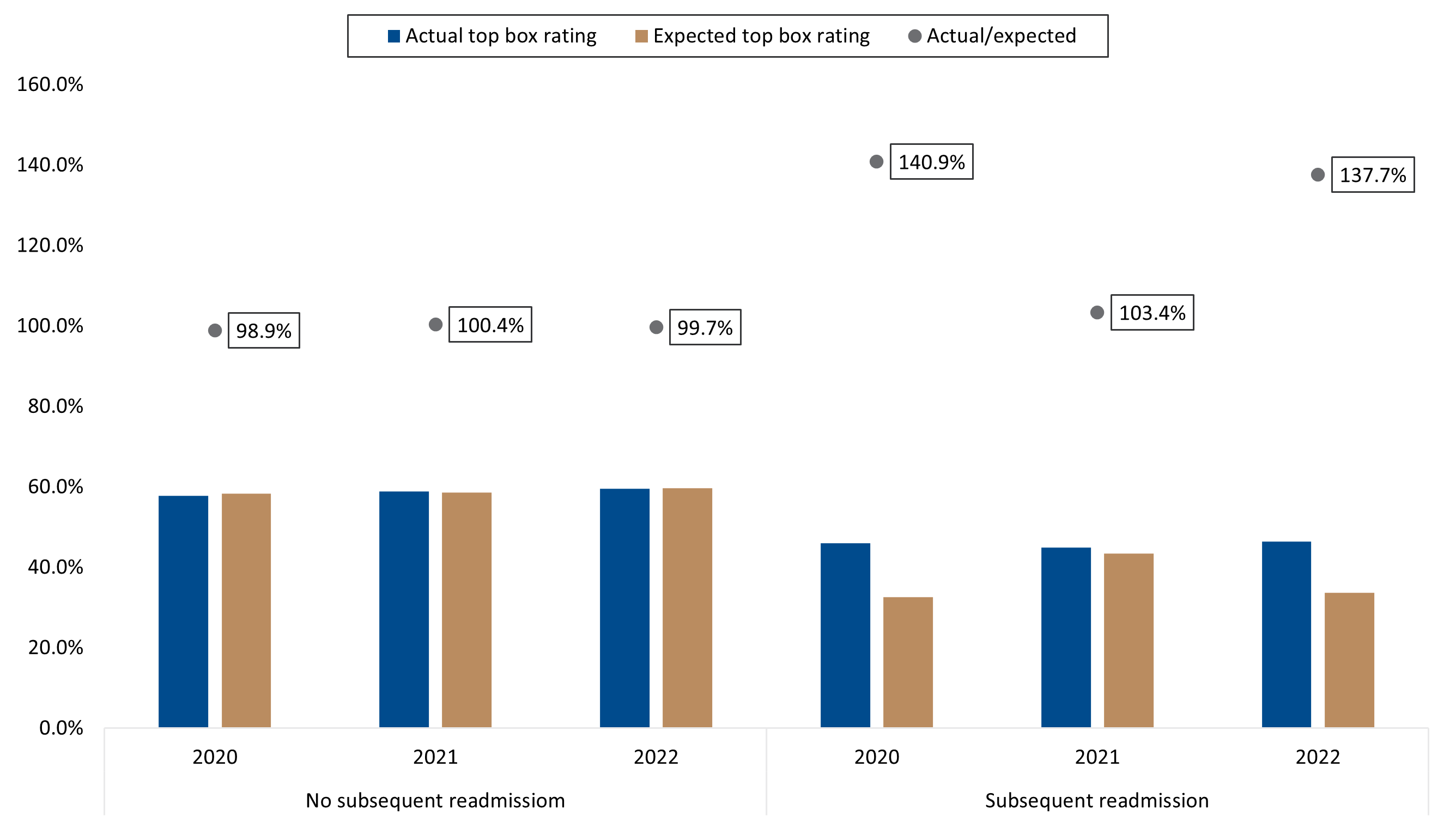 Among patients with no unplanned readmission, the expected proportion who scored a top box rating was very close to the actual proportion (where actual/expected was between 98.9% and 100.4%).