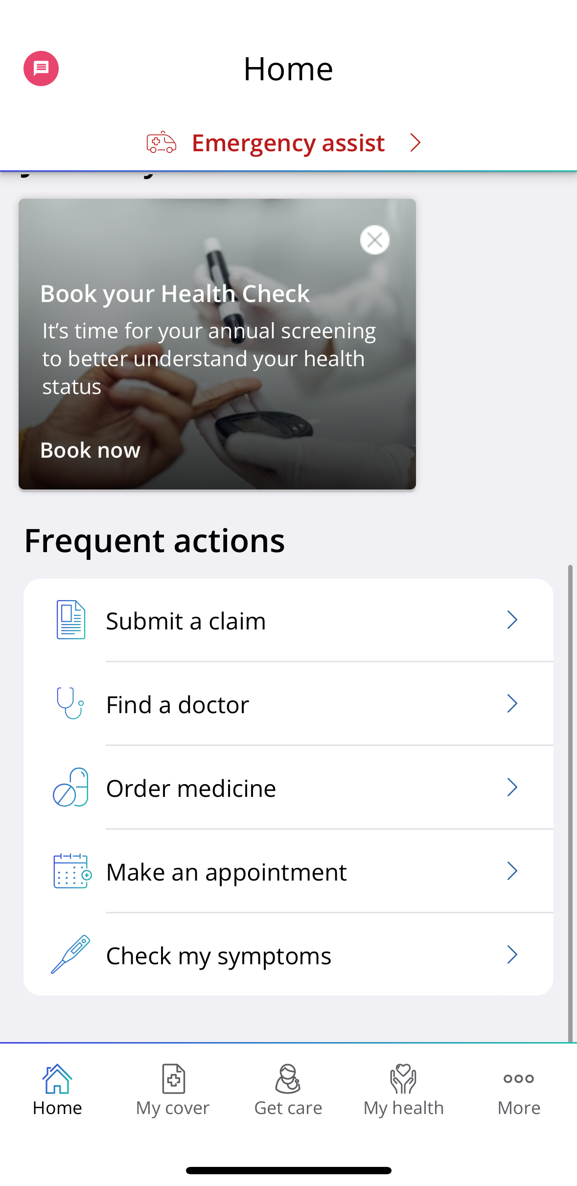 1. Log in to the Discovery Health app and click the Check my symptoms button at the bottom of the home page or in the Get care section of the app.