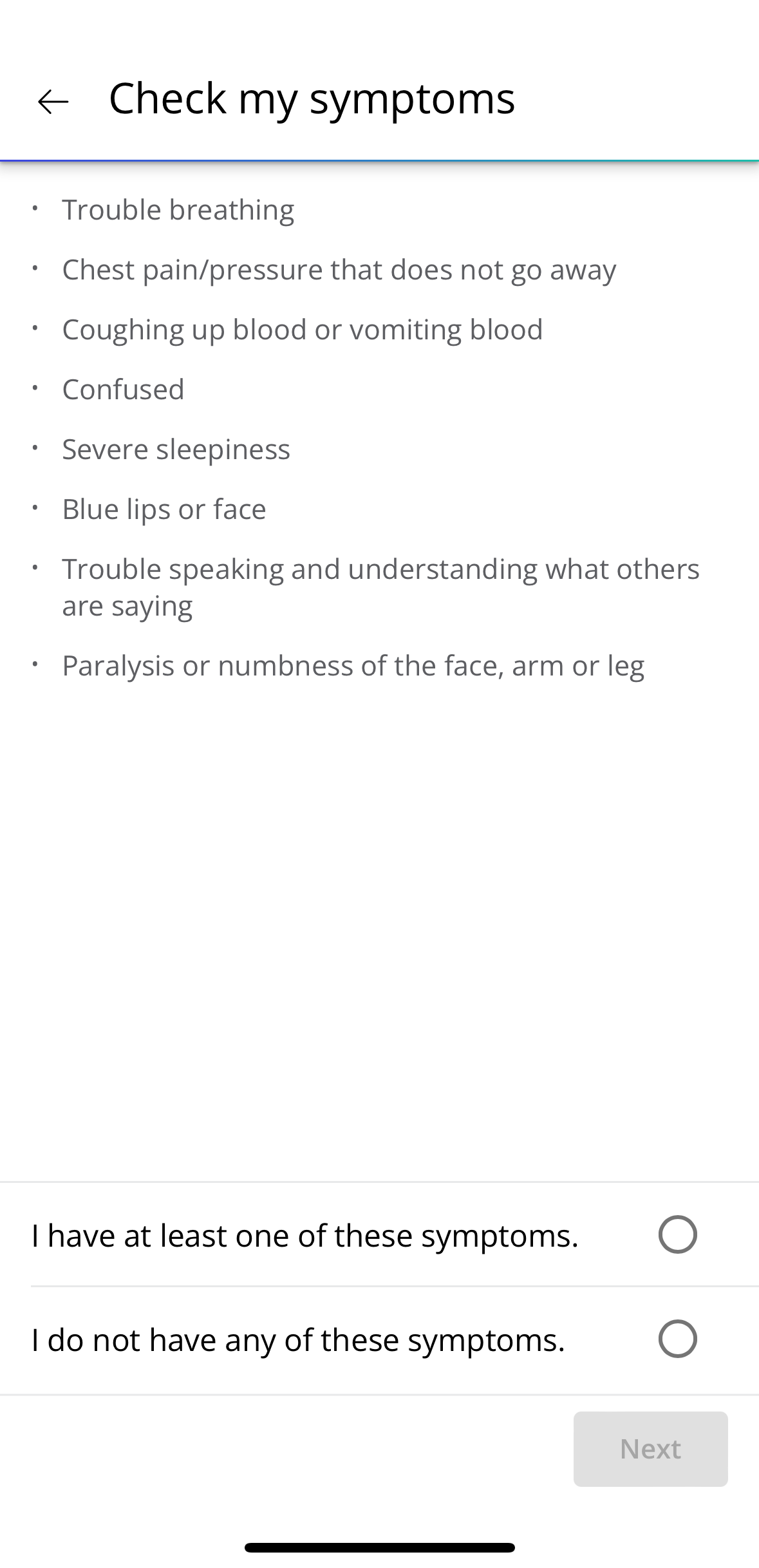 2. A list of symptoms that are linked to emergency conditions will appear. Choose if you are experiencing any of those symptoms or not.