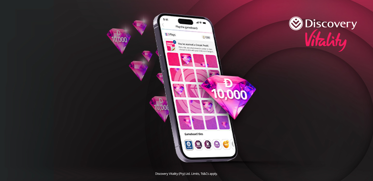 To celebrate Vitality Active Rewards' 10-year anniversary, we'll be hiding a limited-edition Vitality diamond worth Ð10,000 on your gameboard in the Discovery Bank app during the month of October.