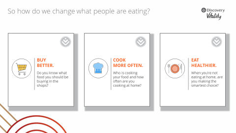 Our strategy to help make our members' eating habits as healthy as possible can be summarised in three simple words: buy, cook, and eat.