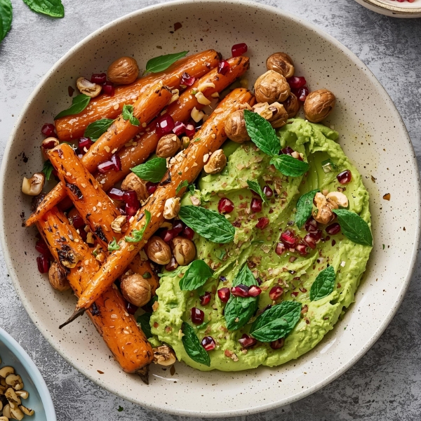 Sizzling carrots with hazelnuts, smashed avocado, pomegranate and