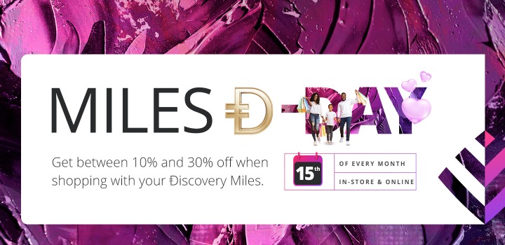Plus, Discovery Bank will double your discount on the 15th of every month when you spend your Ðiscovery Miles at our retail partners.