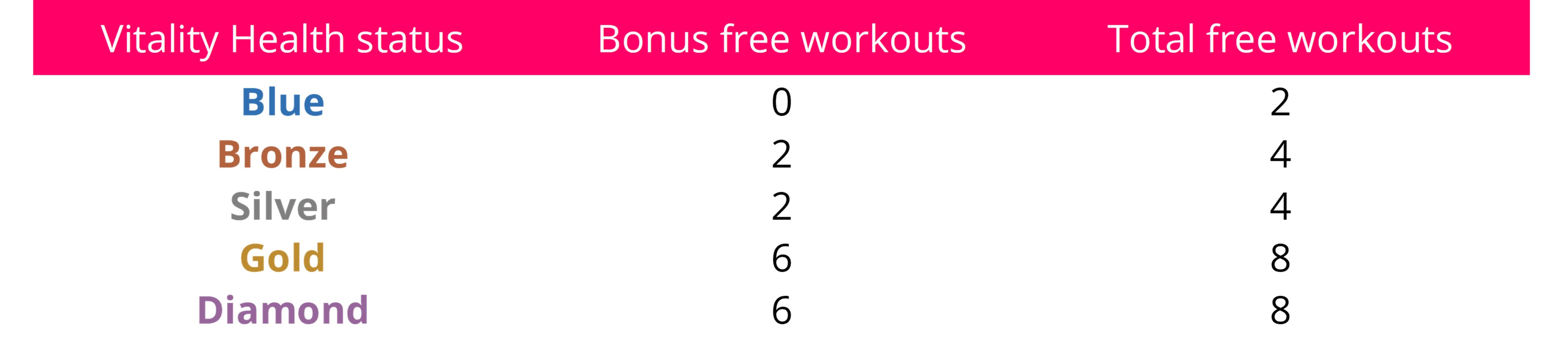It's simple. The higher your Vitality Health status, the more you get rewarded. You already get 2 free workouts a month with Vitality Fitness. Here's how you can earn up to an additional 6 free workouts with a qualifying Vitality Premium or Vitality Active membership: