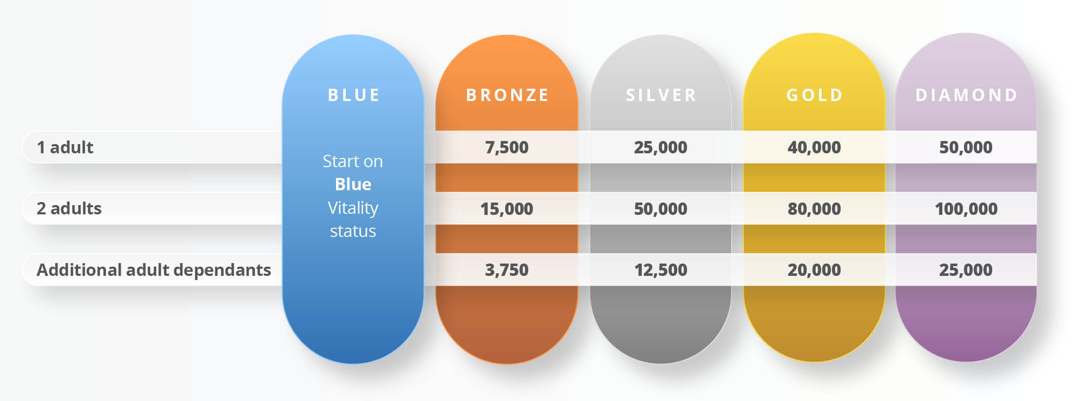 You can earn Vitality points every time you take a step to know or improve your health. All these points add up towards your Vitality Health status.