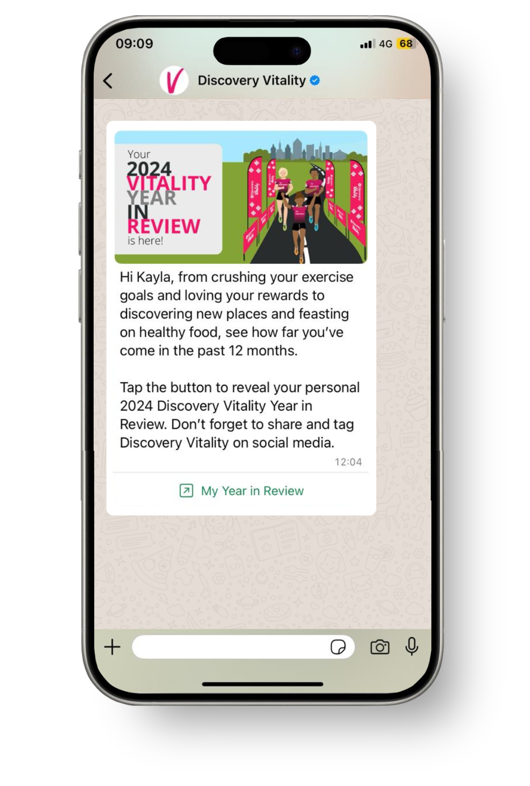 You may have unsubscribed from our Vitality communications! Follow these steps to access your personal 2024 Vitality Year in Review through Ask Discovery on WhatsApp, your virtual assistant available 24/7.